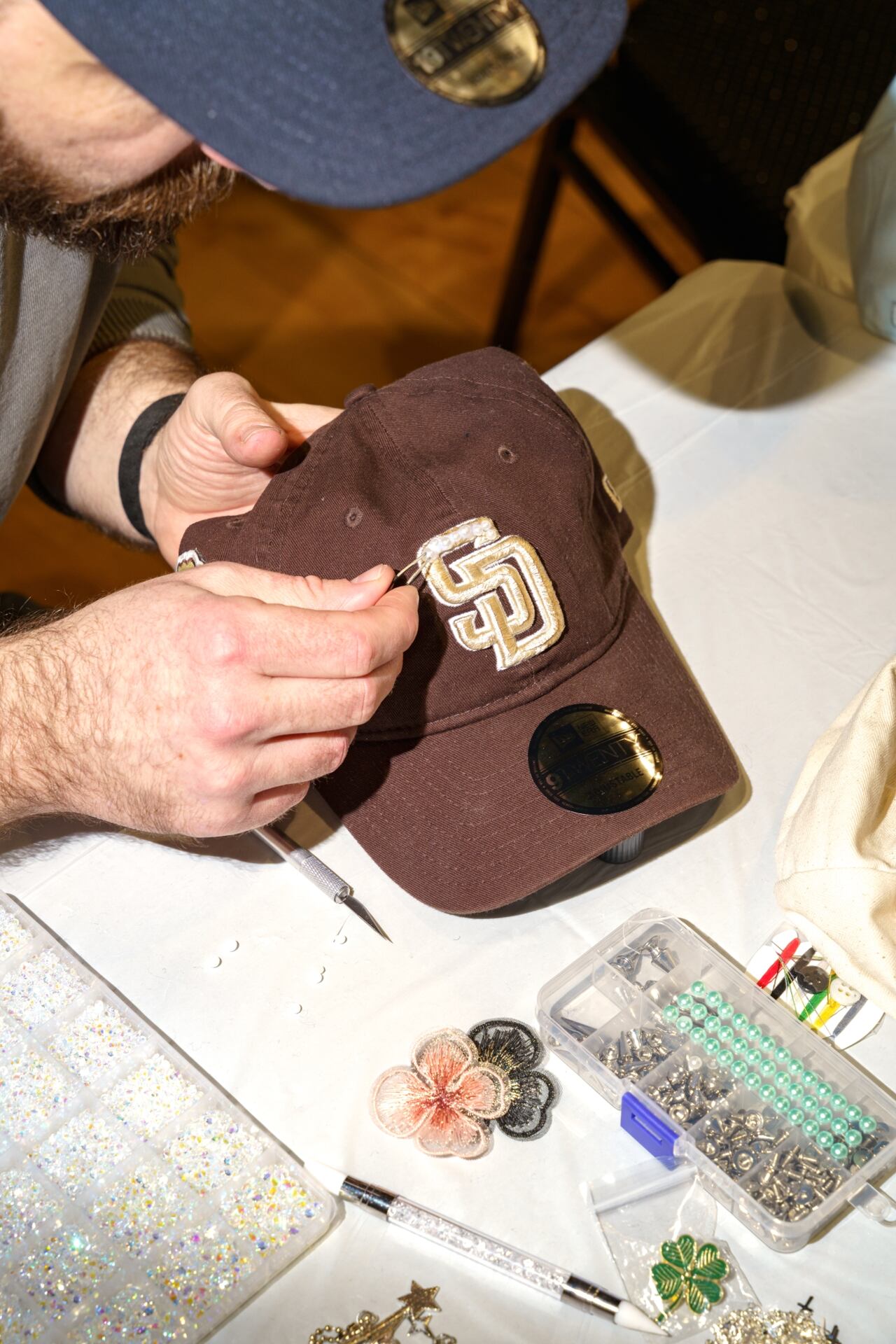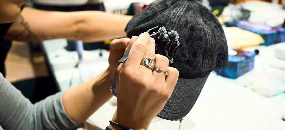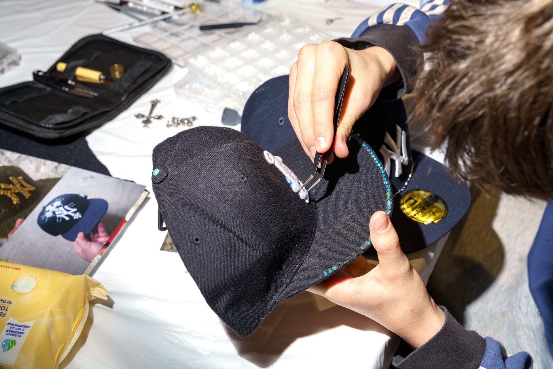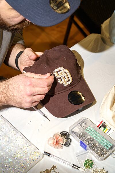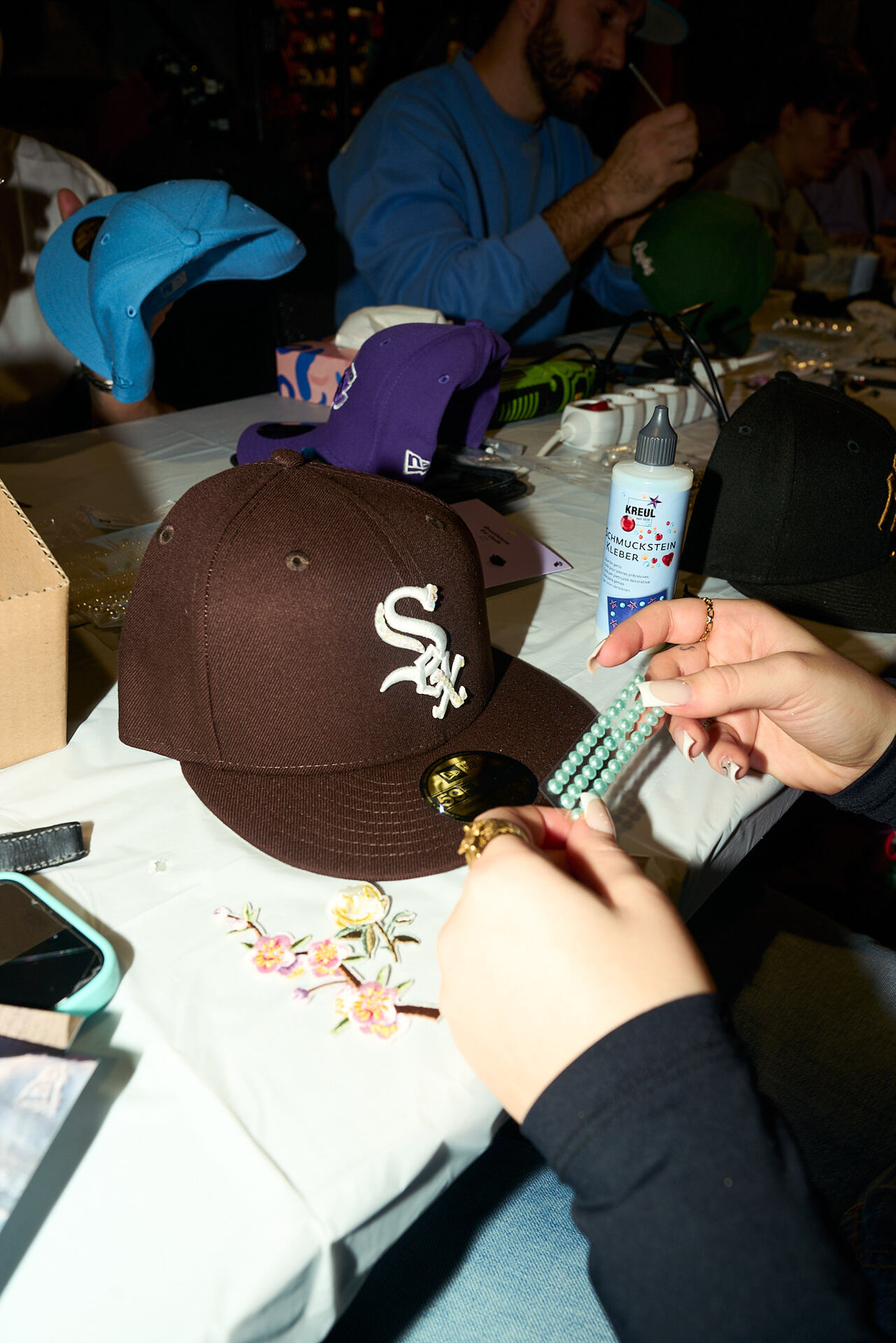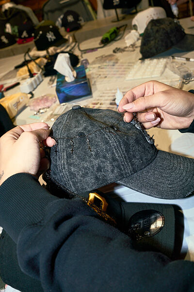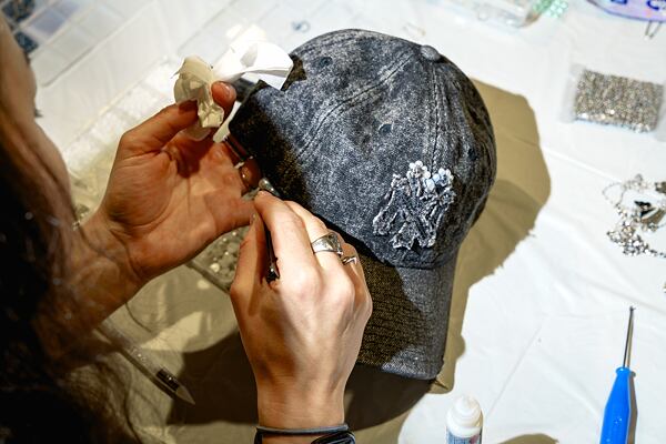 Gluing pearls and rhinestones onto a cap.
