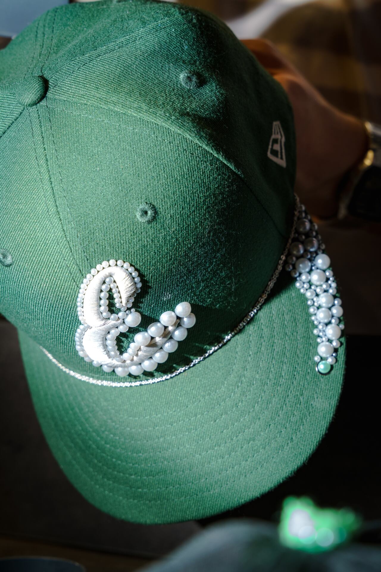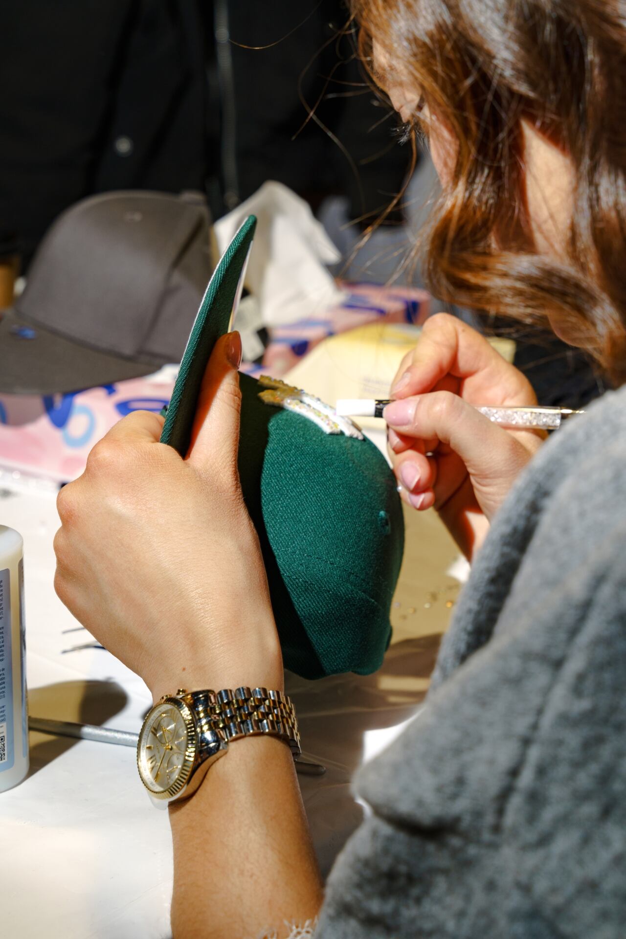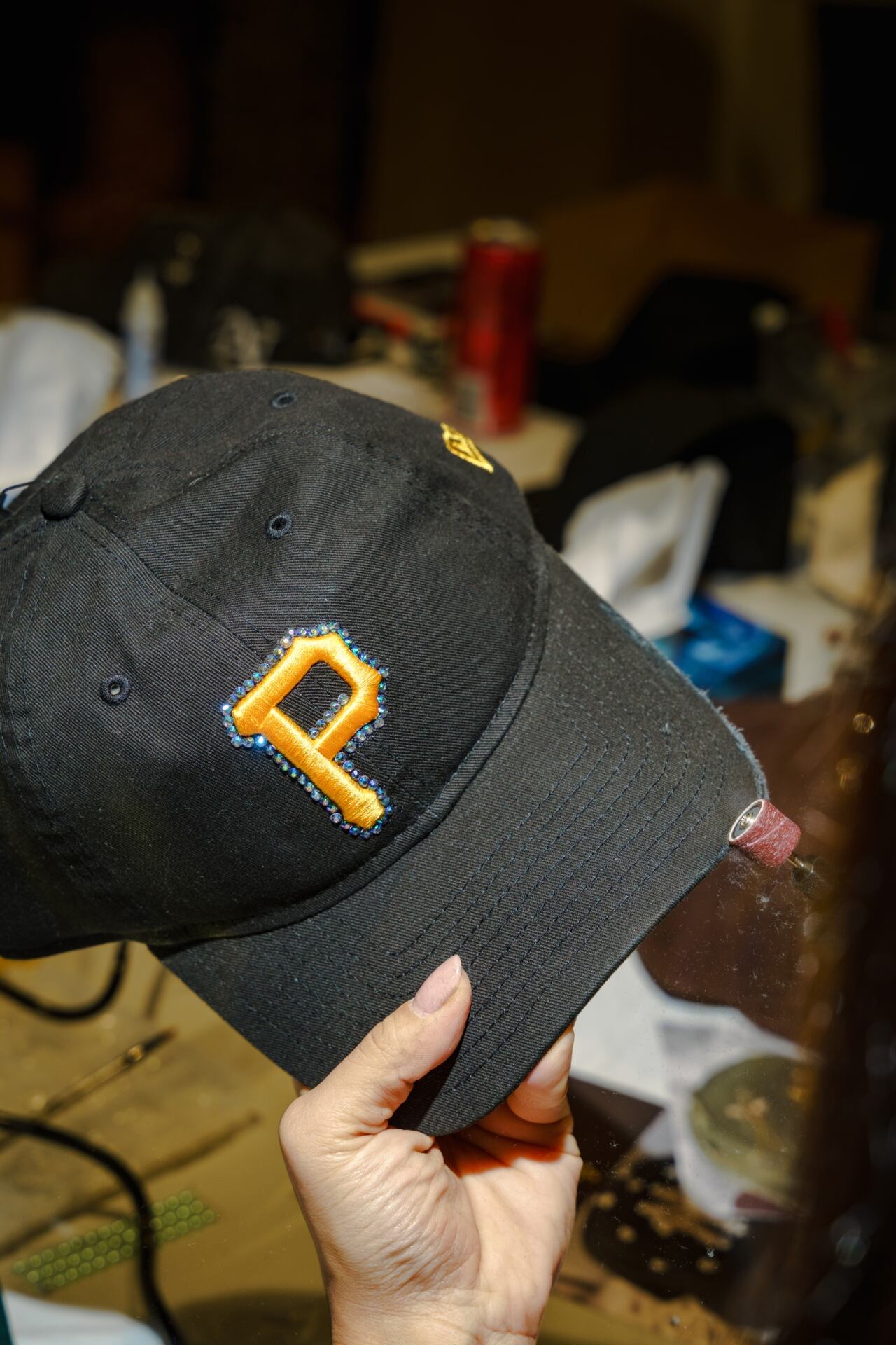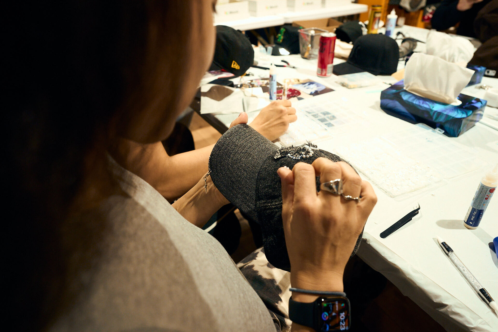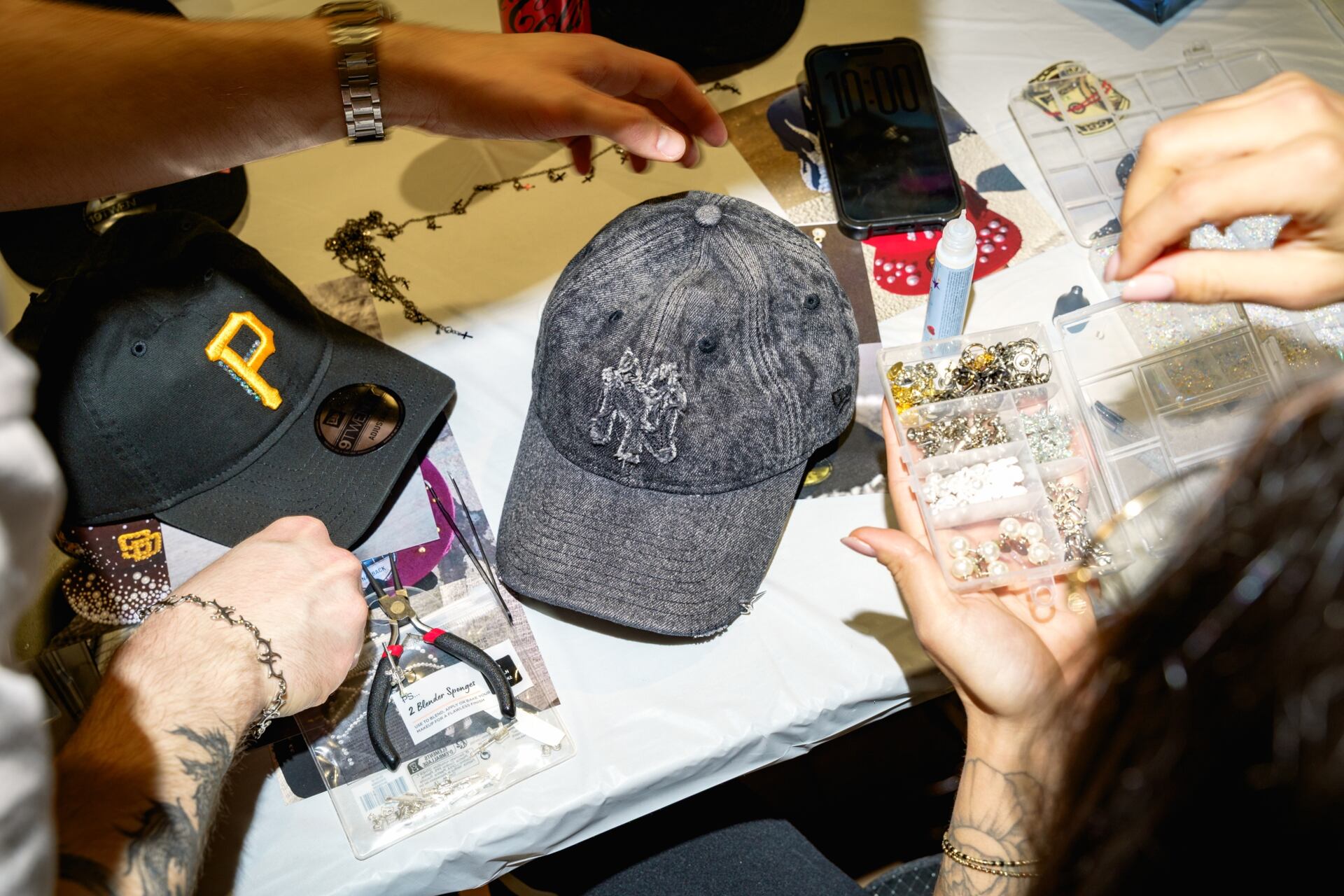 Gluing pearls and rhinestones onto a cap.