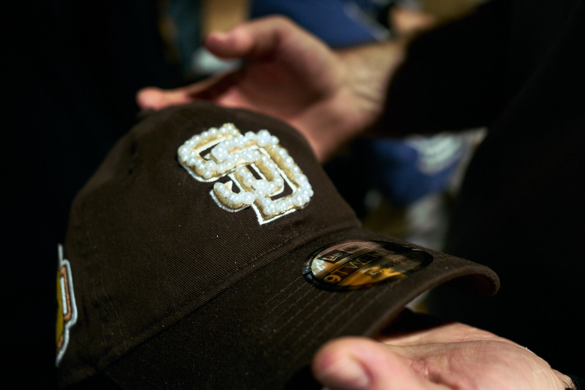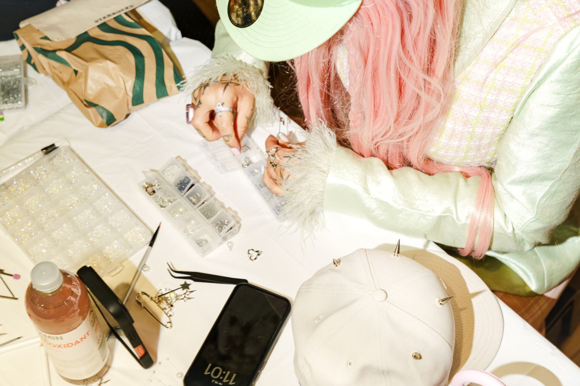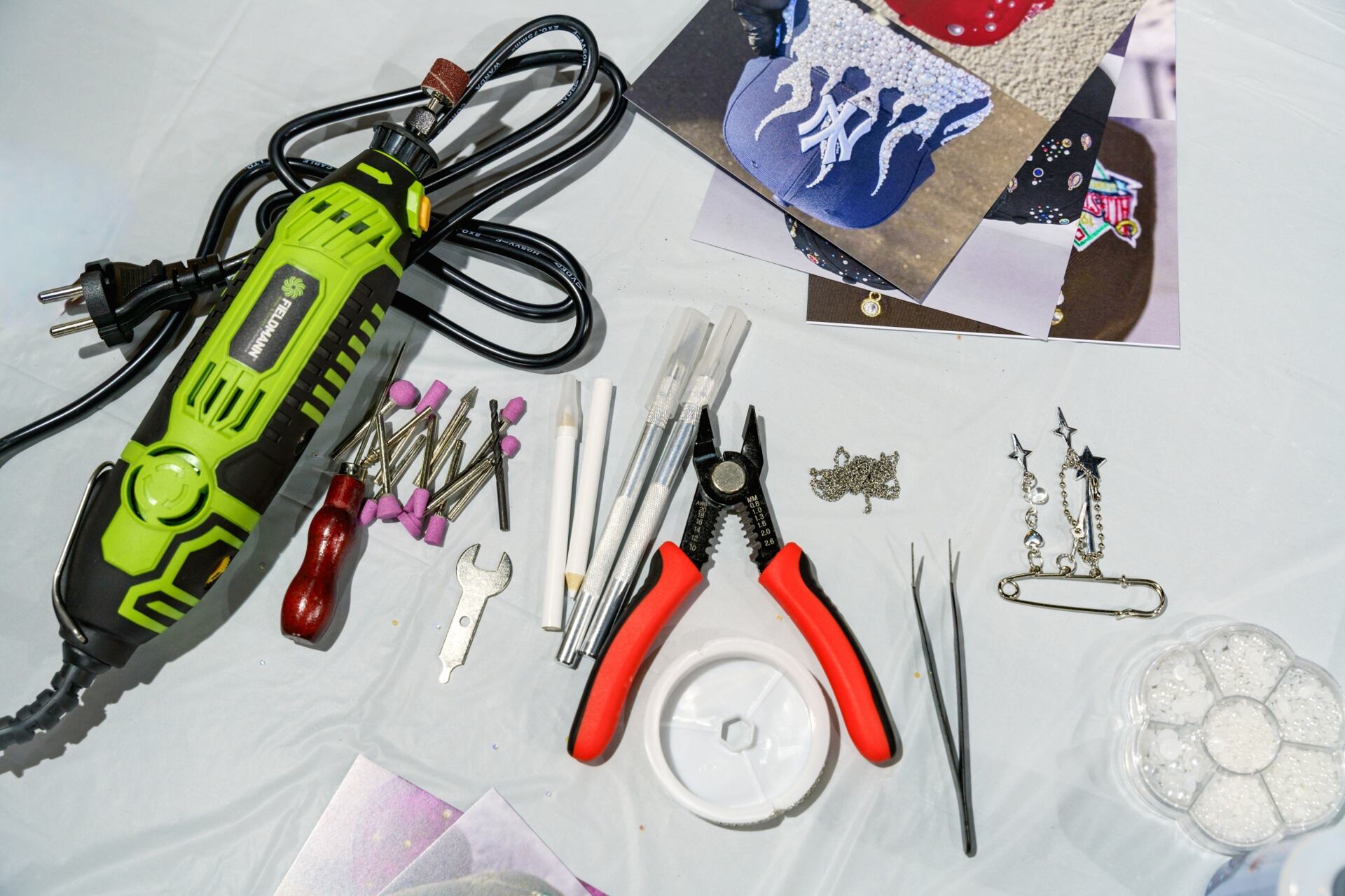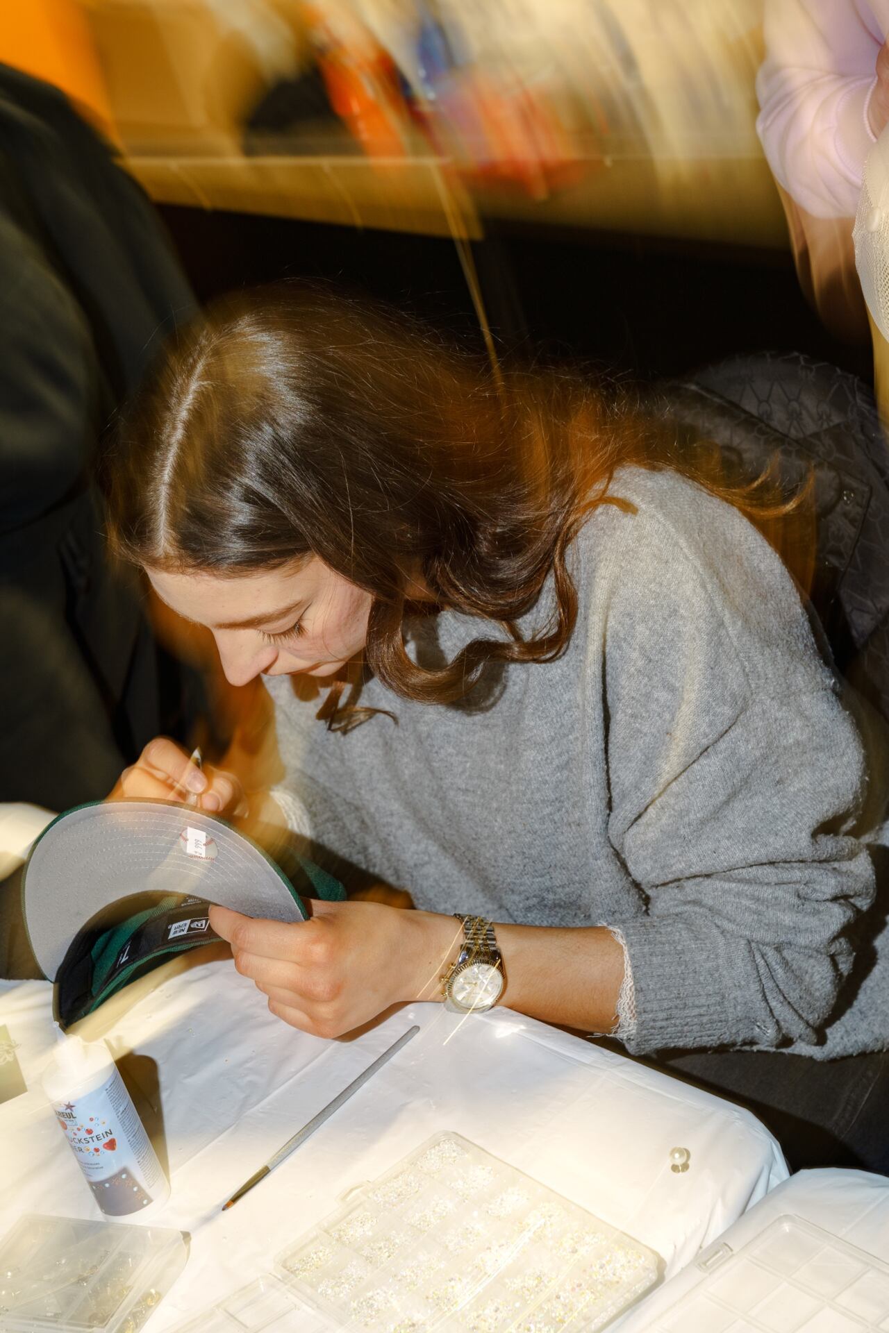 Gluing pearls and rhinestones onto a cap.