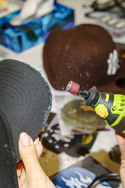 Sanding the brim for a distressed effect.