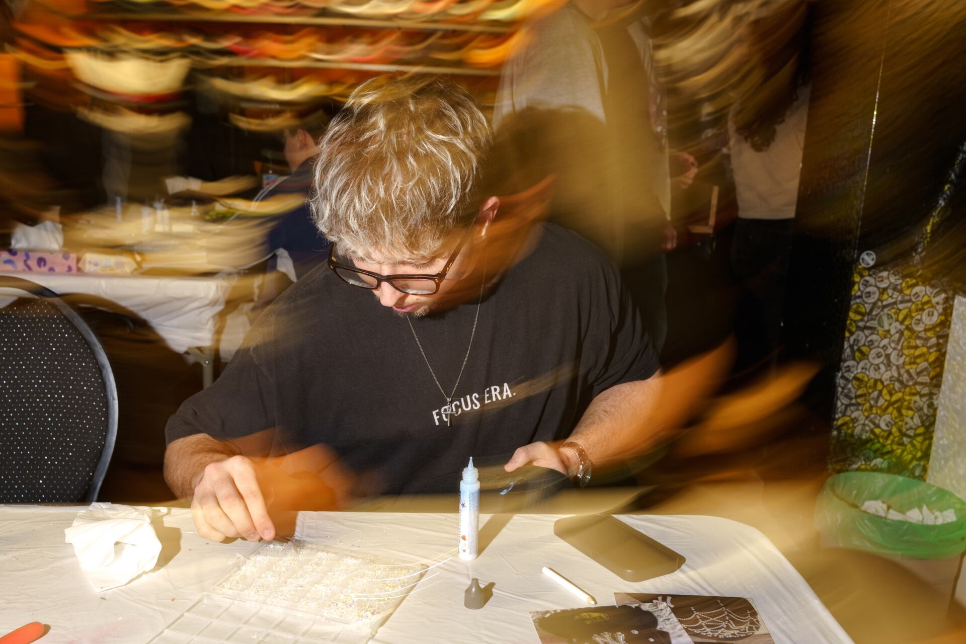 Music, concentration, sparkle of rhinestones, piles of pearls on the tables, and the gentle sound of the grinder in the background.
