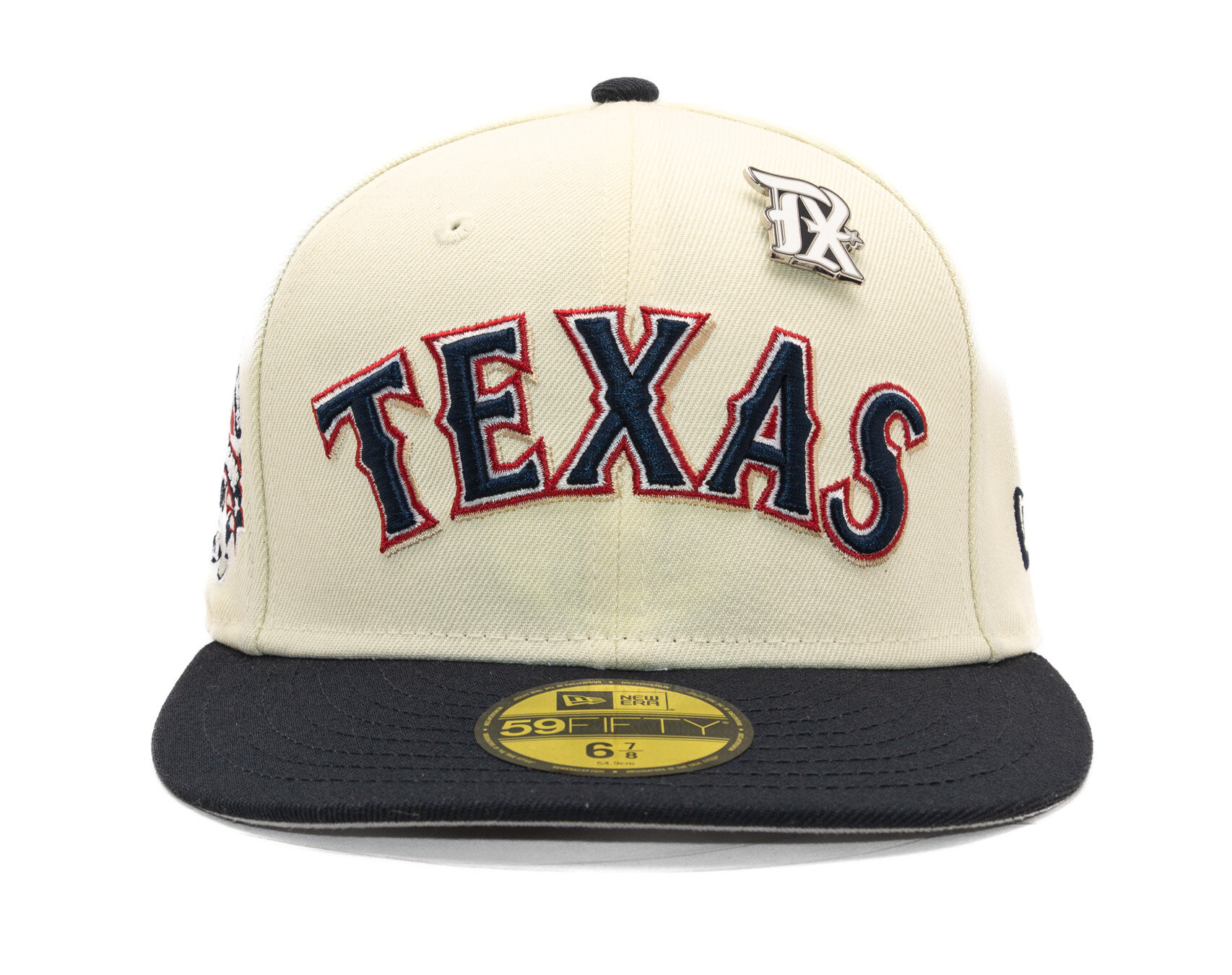 White Men's New Era Cap with the motif of the Texas Rangers baseball team.