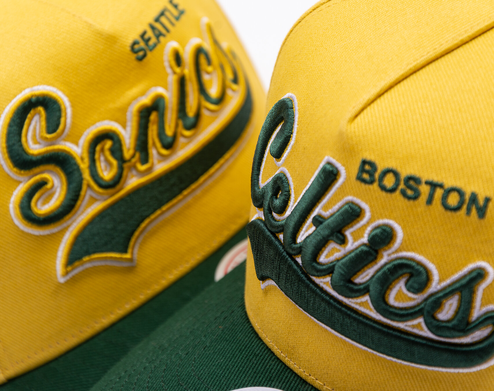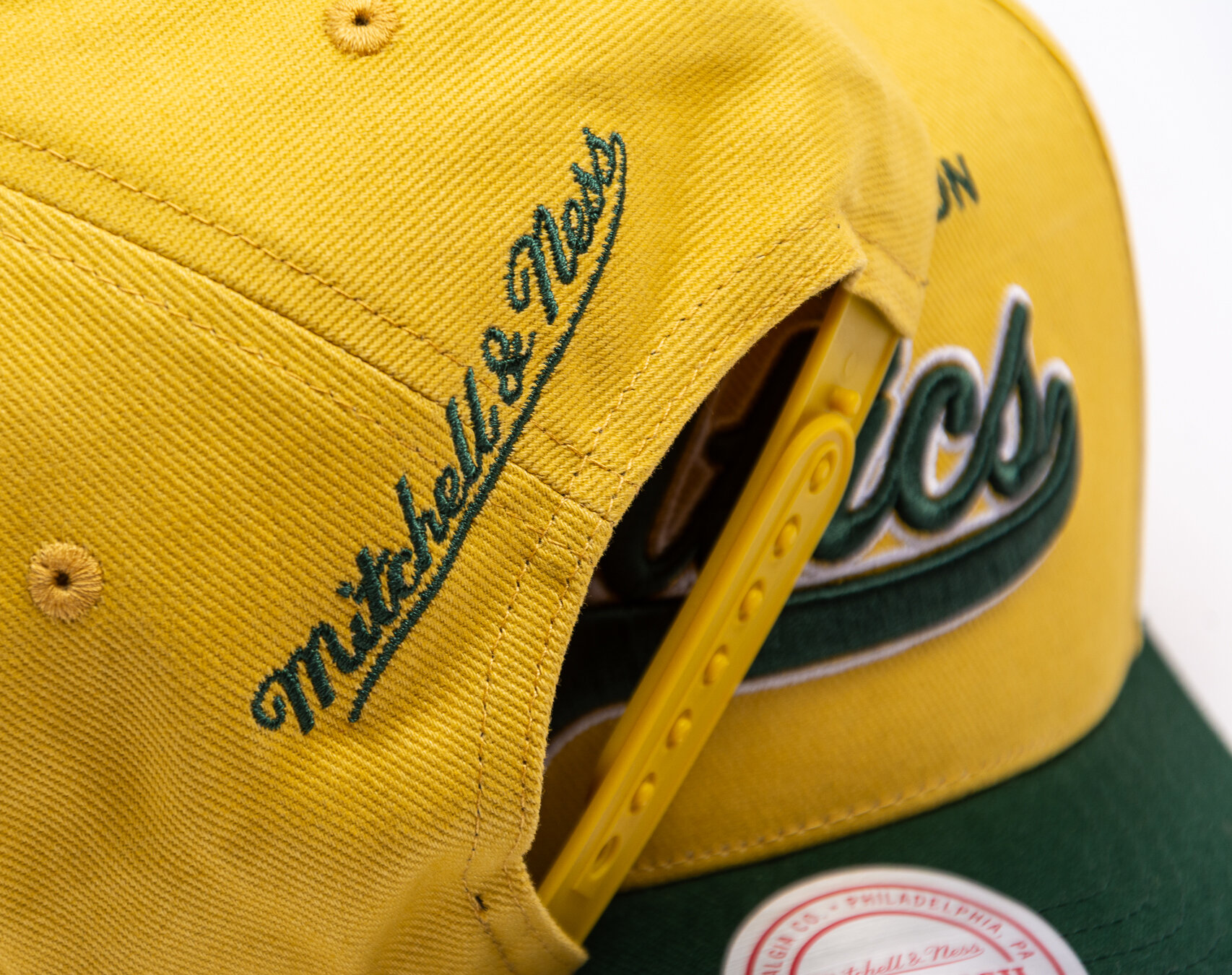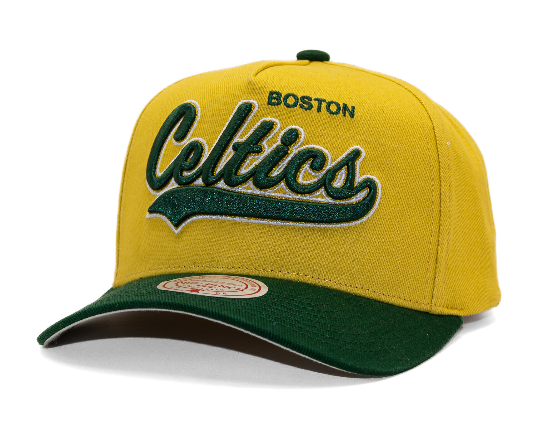 Yellow Men's Mitchell & Ness basecap with the motif of the Boston Celtics basketball team.