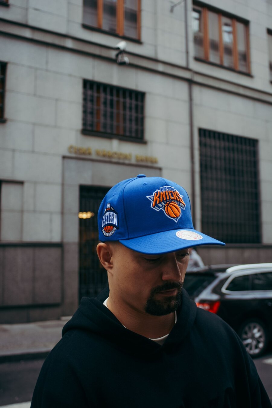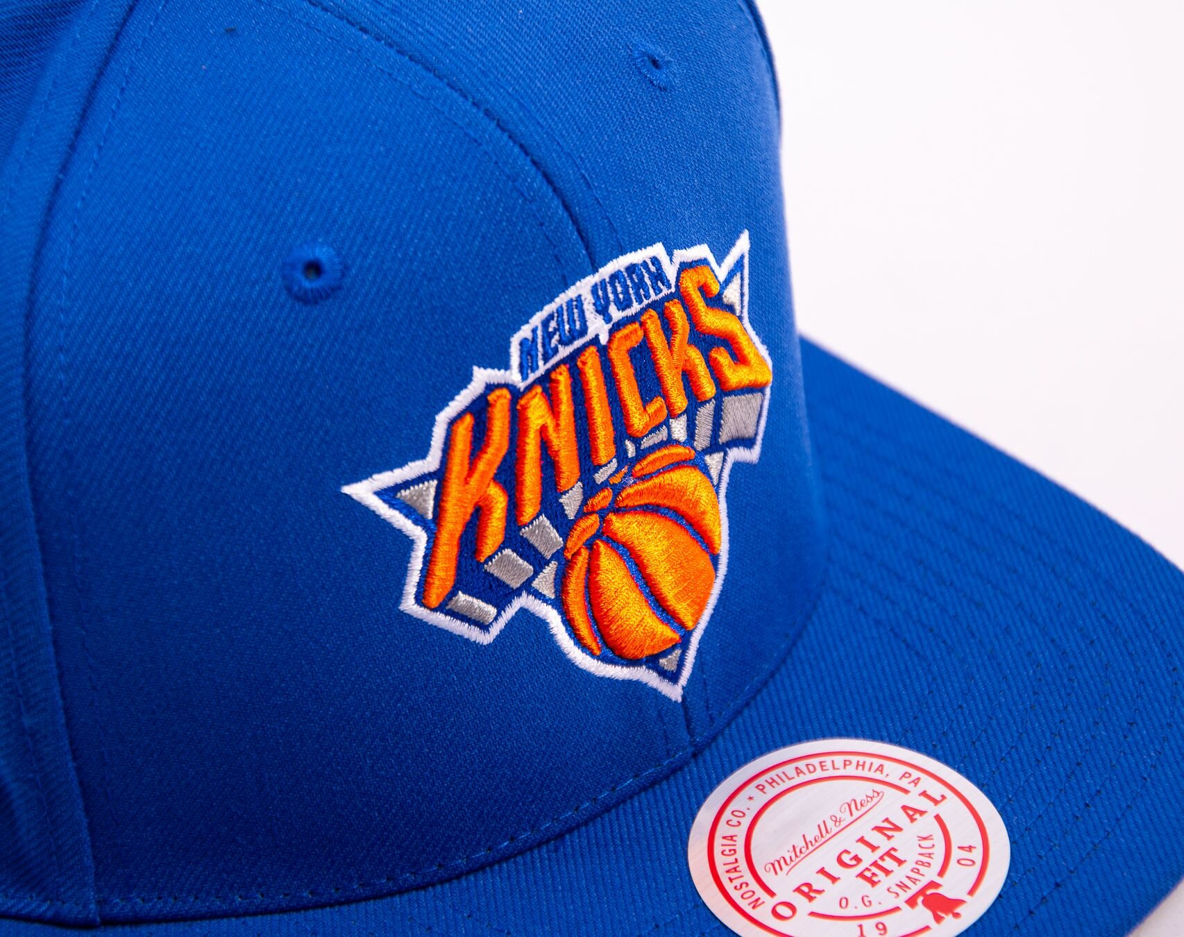 Blue unisex Mitchell & Ness Cap with the motif of the New York Knicks basketball team.