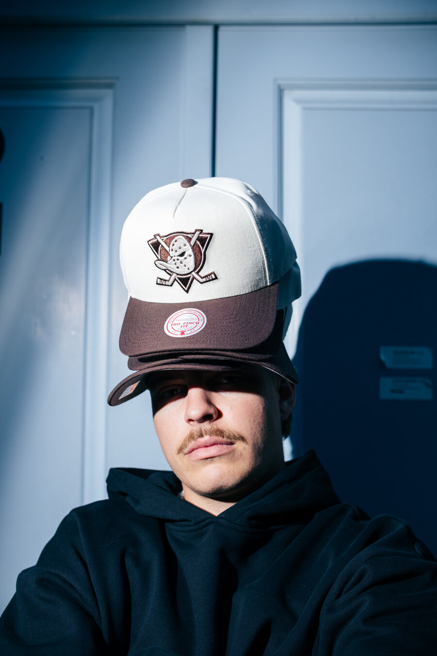 Brown Men's Mitchell & Ness Cap with the motif of the Anaheim Ducks ice Hockey team.