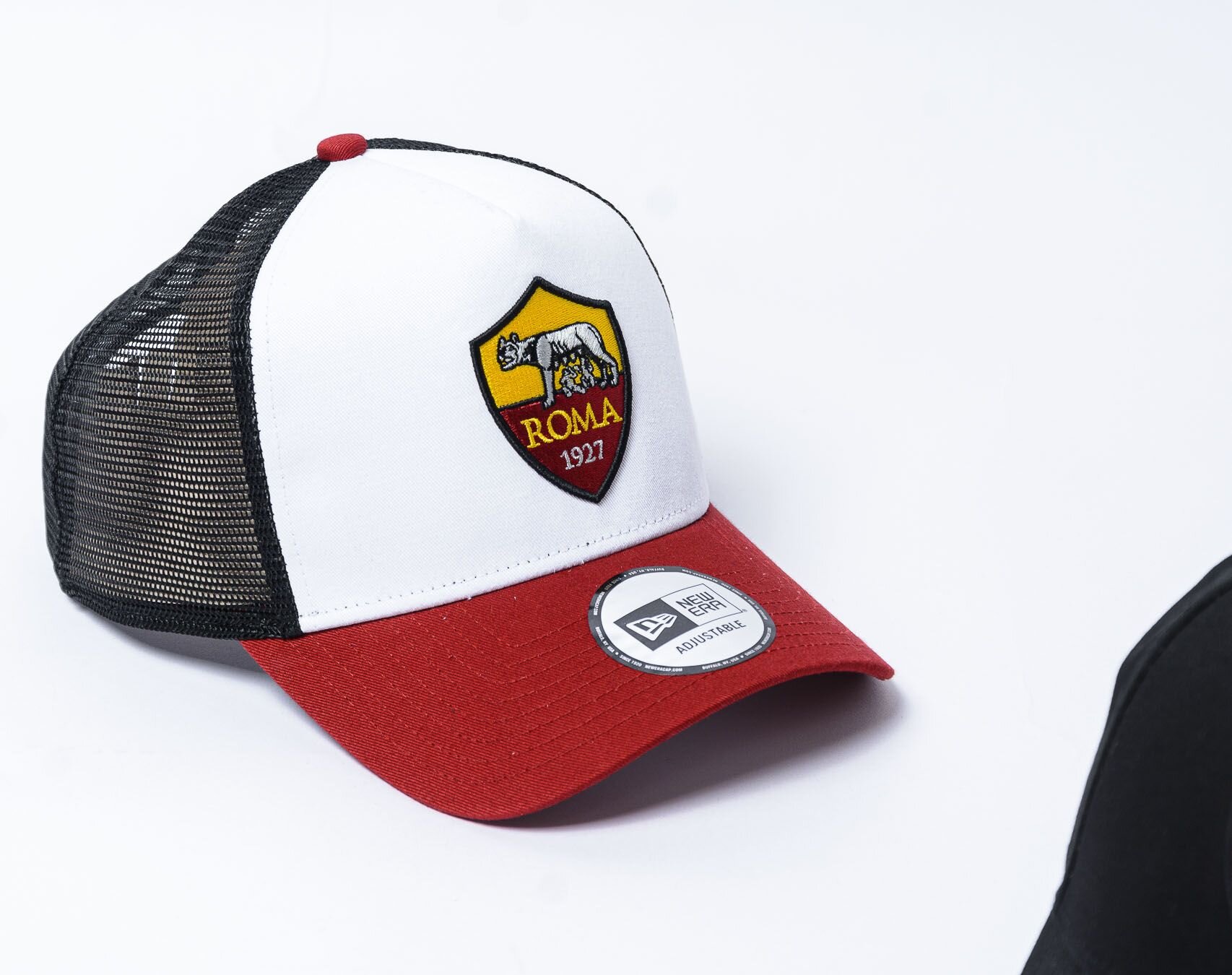 White unisex New Era Cap with the motif of the as roma soccer team.