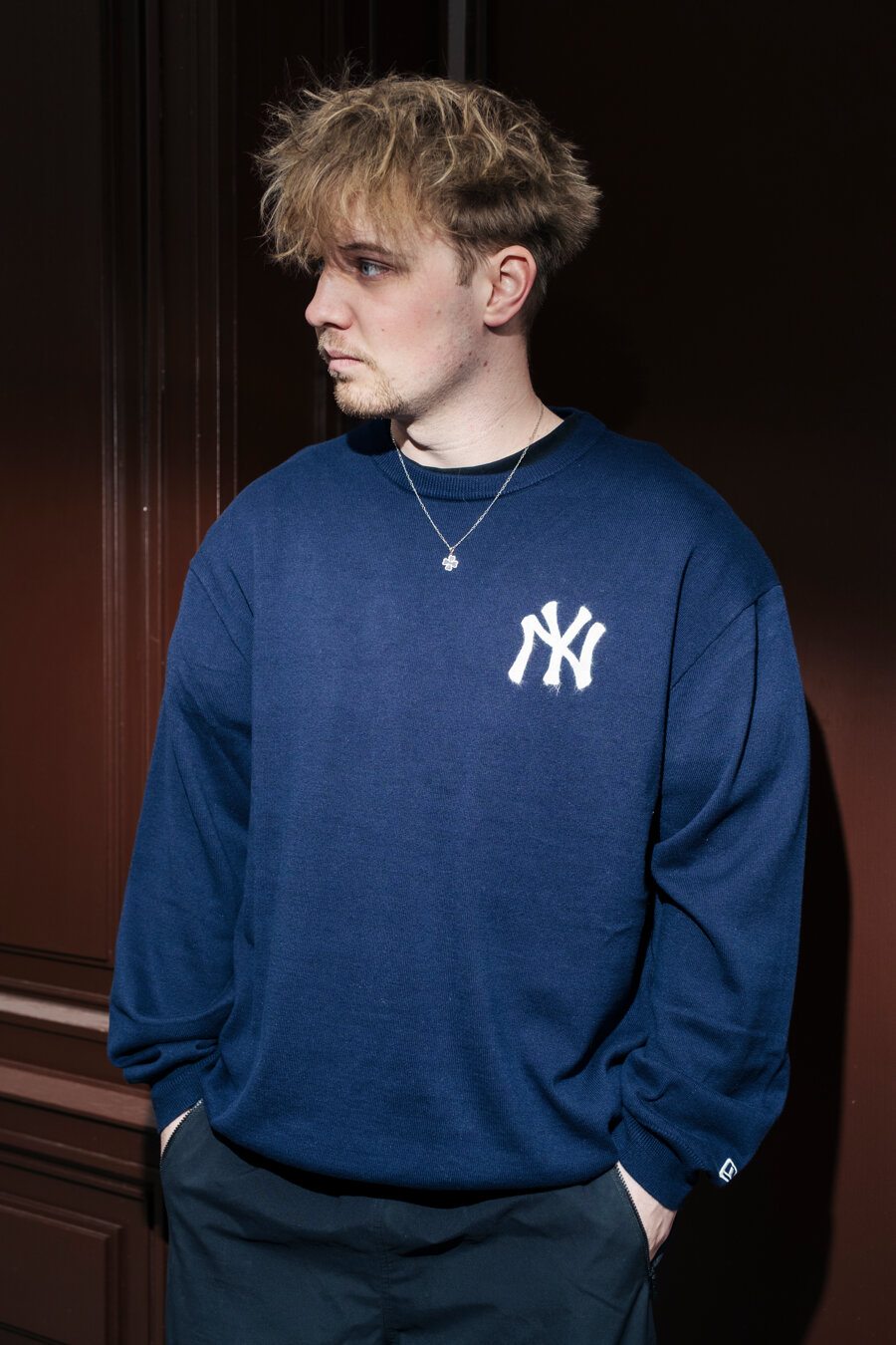 Blue Men's New Era sweater with the motif of the New York Yankees baseball team.